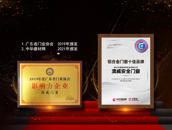 ① 中國商品質量名優品牌推廣中心 2010年頒發《商品與質量》消費市場調查中心 2010年頒發 ② 廣東省門業協會 2017年頒發